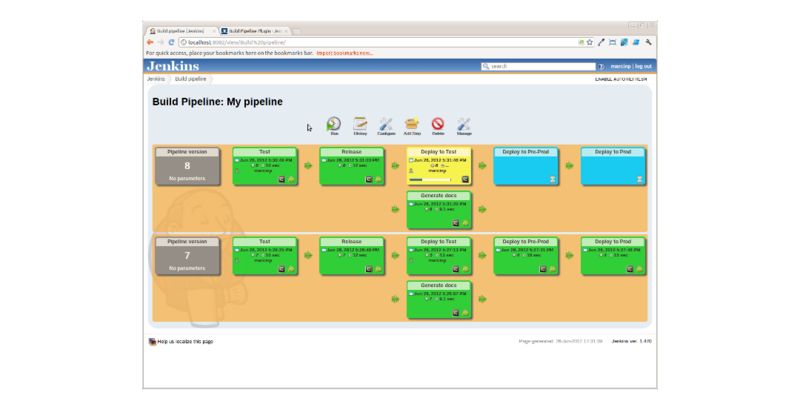 对一个系统的持续集成会包含很多个方面,如果将它们都杂糅在一个 Jenkins 任务中,会提高排查成本,也不利于整个持续集成的运作。Build Pipeline plugin 可以让项目管理员针对系统持续集成步骤设置一系列关联的任务,任务之间可以设置不同的触发条件,以确认何时需要人工介入。该插件可以让整个持续集成流程变得非常直观: