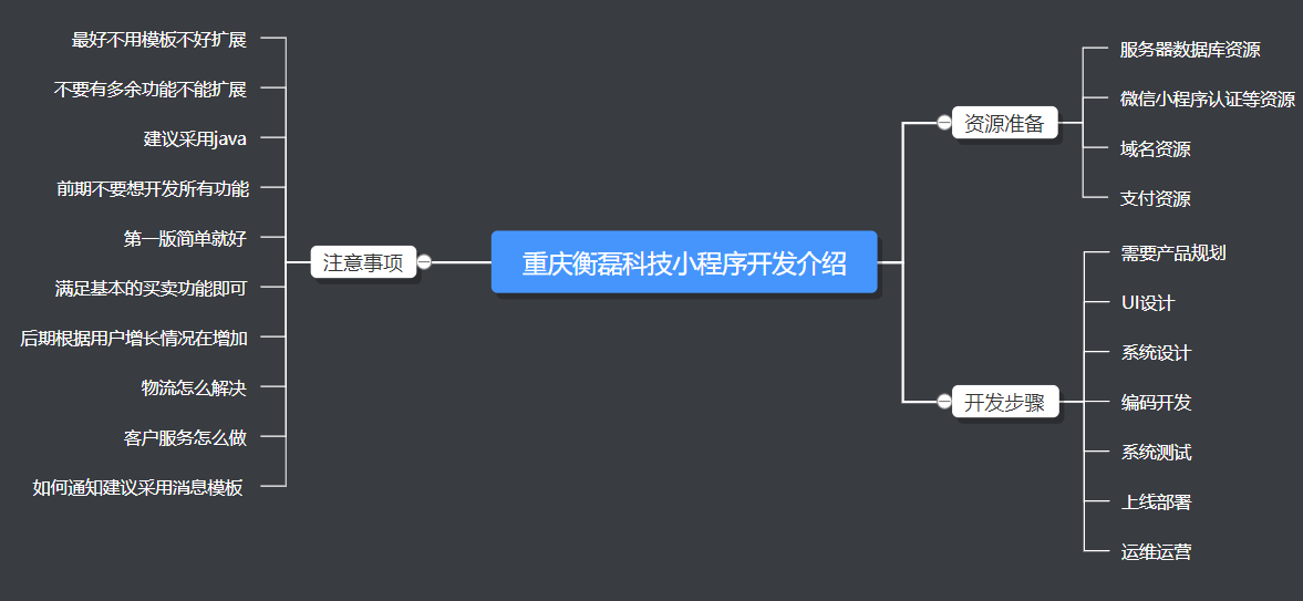 受疫情影响,很多线下实体不能进行营业,大家为战疫情,共克时艰。在疫情面前,很多人看到了电商的机会。因为一做电商就需要一个平台,在小的个体都有自己的品牌。为了很多用户都会创建自己的电商平台,创建自己的平台首先都会考虑到开发一个小程序有哪些过程步骤需要多少钱。,今天衡量科技就微信小程序开发的两个方面进行介绍首先进行微信小程序开发的步骤介绍,主要经历如下几个步骤。首先资源准备,找好合作开发方,开发经历的步骤有产品规划设计、UI规划设计、系统设计,程序开发、系统测试、部署上线、运维运营。参考如下脑图:也可以随时联系我们进行咨询了解。我们可以从规划设计,到系统开发,运维管理全流程服务。